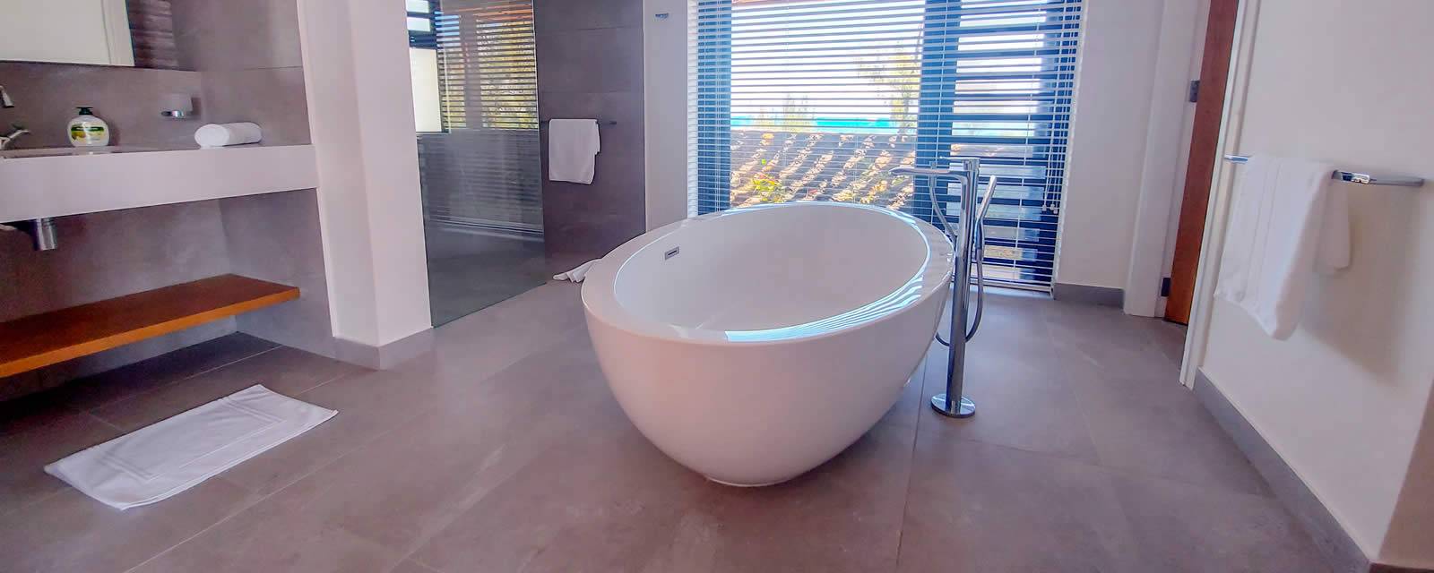 La villa a 3 chambres doubles et 3 salles de bain en suite dont une baignoire. La piscine en face de la villa est privée.