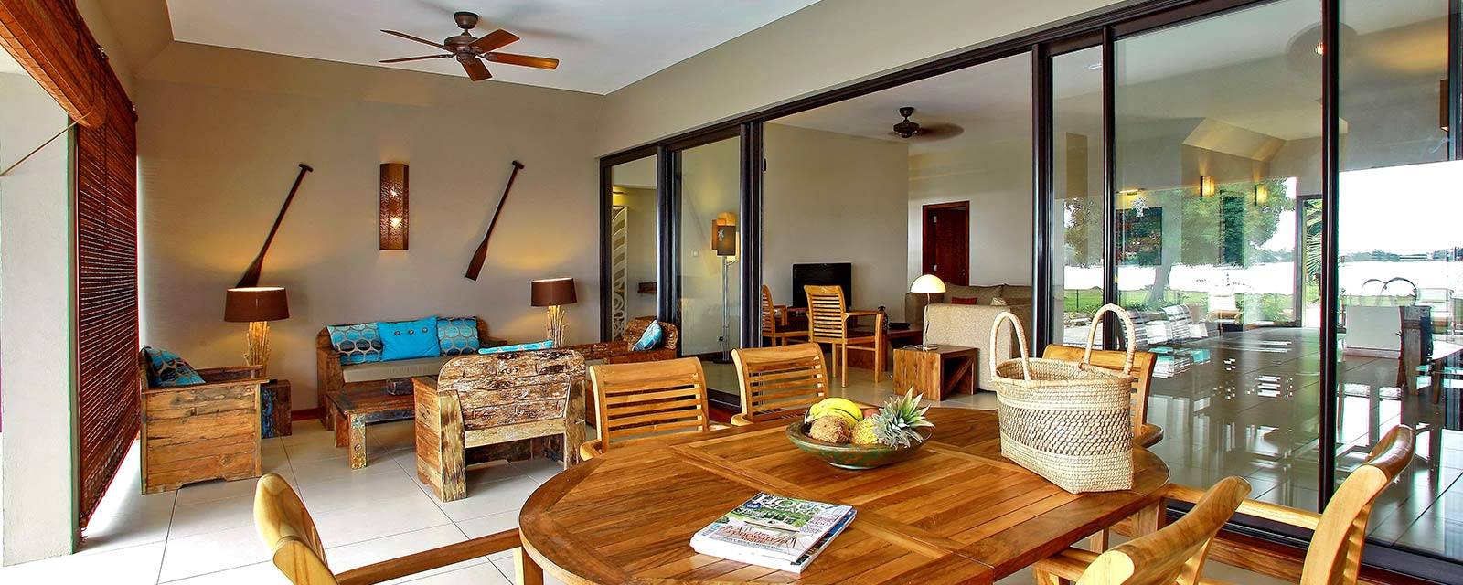 Le séjour et la salle à manger s’ouvrent sur une varangue donnant sur la piscine d’où on peut admirer le va-et-vient des catamarans et des bateaux de pêche dans la baie ainsi que de magnifiques couchers de soleil. Le luxe ici c’est l’espace, la nature et le caractère privé de l’endroit.