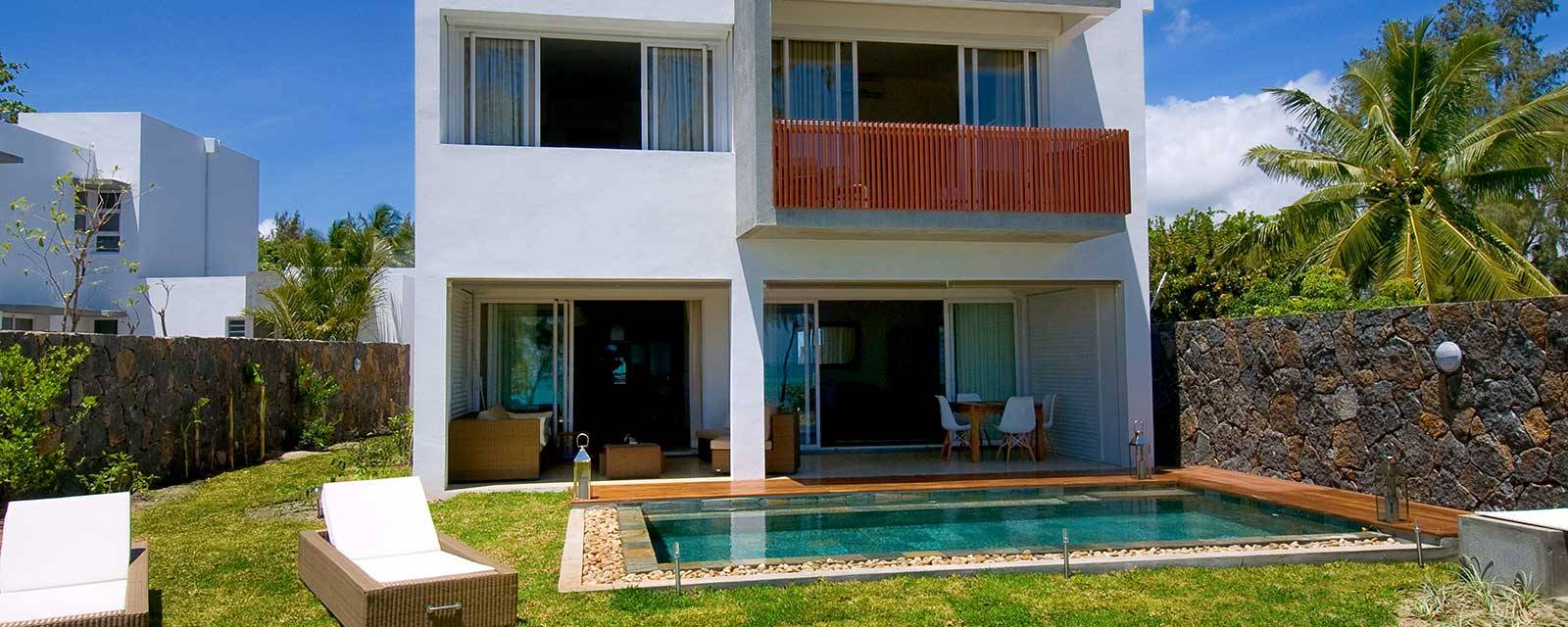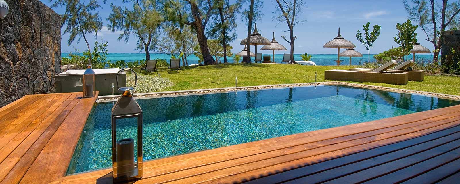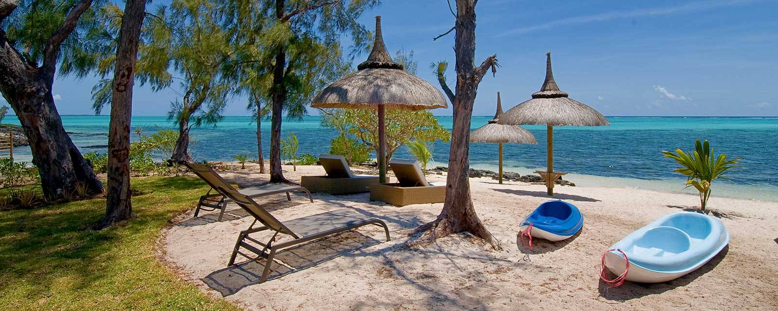 La décoration intérieure est raffinée et contemporaine et elle a d’ailleurs été réalisée par les décorateurs de l’hôtel Royal Palm. Le luxe ici c’est 320m2 d’espace de vie, 5 chambres à coucher,  une piscine privée, un jardin tropical,  une grande plage avec paillottes et transats et des kayaks (gratuits) pour se balader dans le lagon. Au niveau service, il y a 2 femmes de ménage, une pour nettoyer la villa et l’autre pour cuisiner. Enfin, la villa Beau Soleil est bien située,  à mi chemin entre les parcours de golf de Belle Mare et le village de Grand Baie pour l’animation, le choix des restaurants et le shopping.